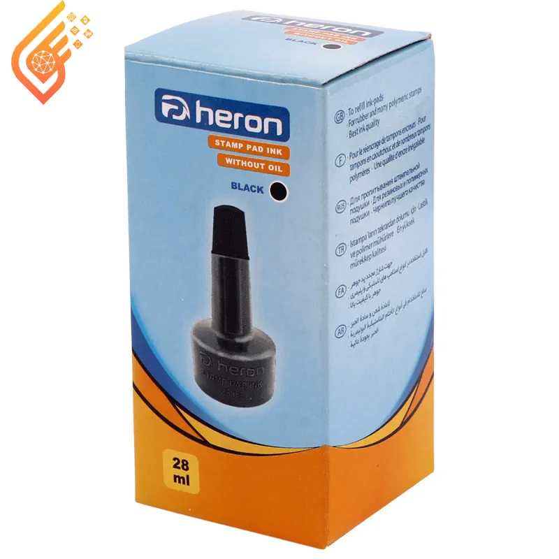 جوهر استامپ Heron با حجم ۲۸ میلی‌لیتر گزینه‌ای عالی برای شارژ مجدد انواع استامپ‌های لاستیکی و پلیمری است. این جوهر دارای اپلیکاتور قطره‌چکانی بوده که از هدر رفت و ریختن ناگهانی جوهر جلوگیری می‌کند و استفاده از آن را بسیار آسان می‌سازد.